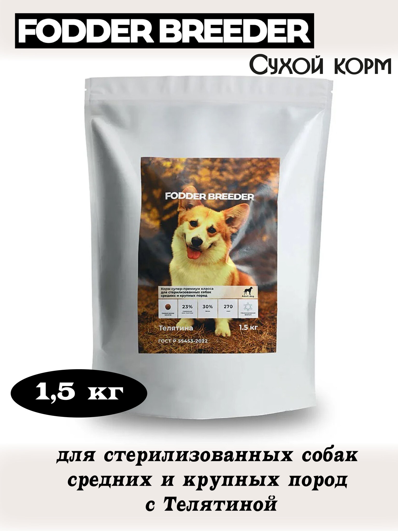 FODDER BREEDER — это сухой полнорационный ежедневный корм с телятиной, который предназначен для стерилизованных собак средних и крупных пород.