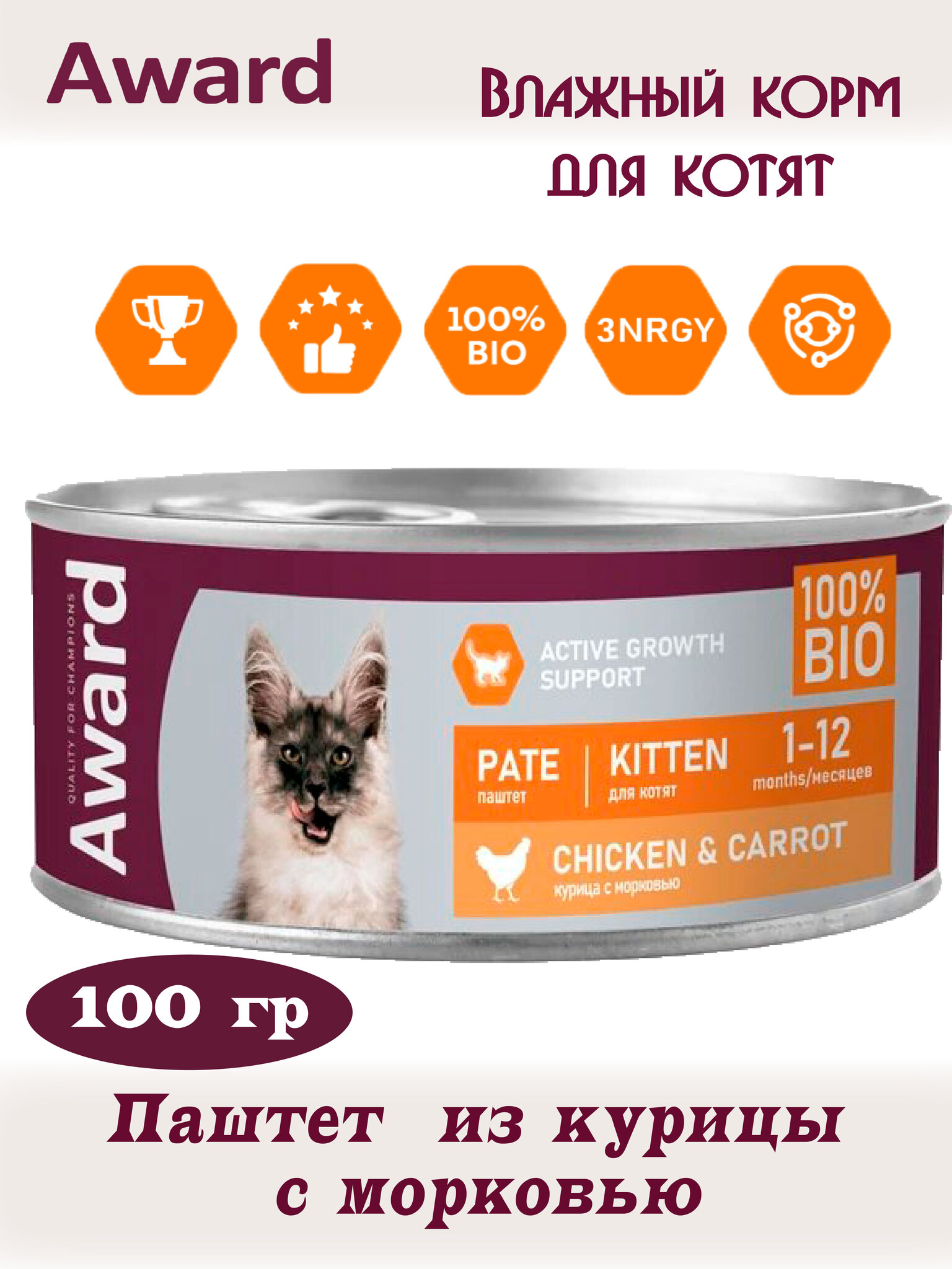 Влажный корм AWARD для котят — это высококачественный паштет из курицы с добавлением моркови, специально разработанный для удовлетворения потребностей растущих котят. Упаковка содержит 100 г нежного корма, который станет отличным источником питательных веществ и энергии для вашего маленького пушистого друга.