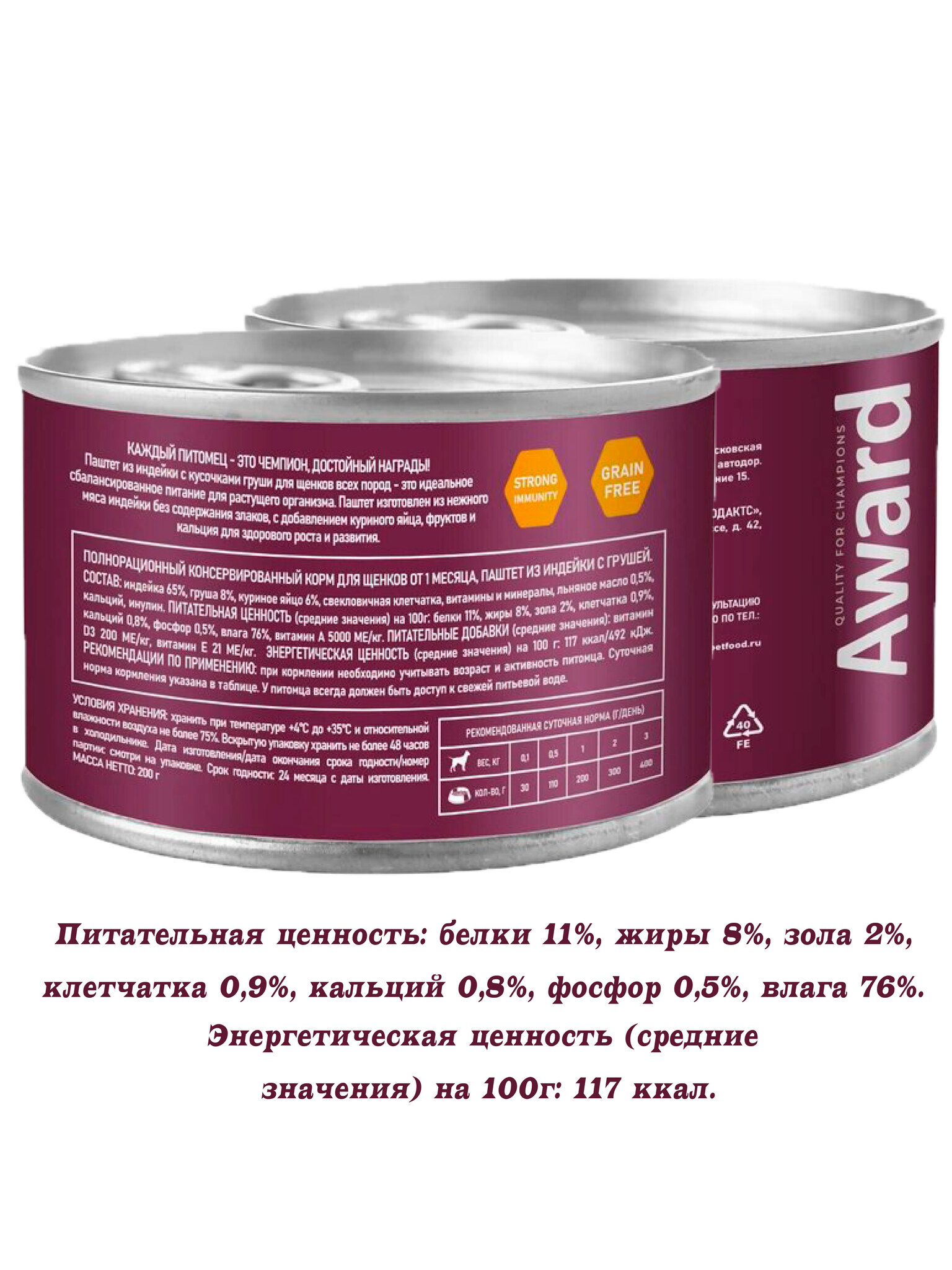 Влажный корм AWARD — это идеальный выбор для щенков старше одного месяца, обеспечивающий их всеми необходимыми питательными веществами для здорового роста и развития. Паштет из индейки в сочетании с нежной грушей создает уникальный вкус, который понравится даже самым привередливым маленьким гурманам.