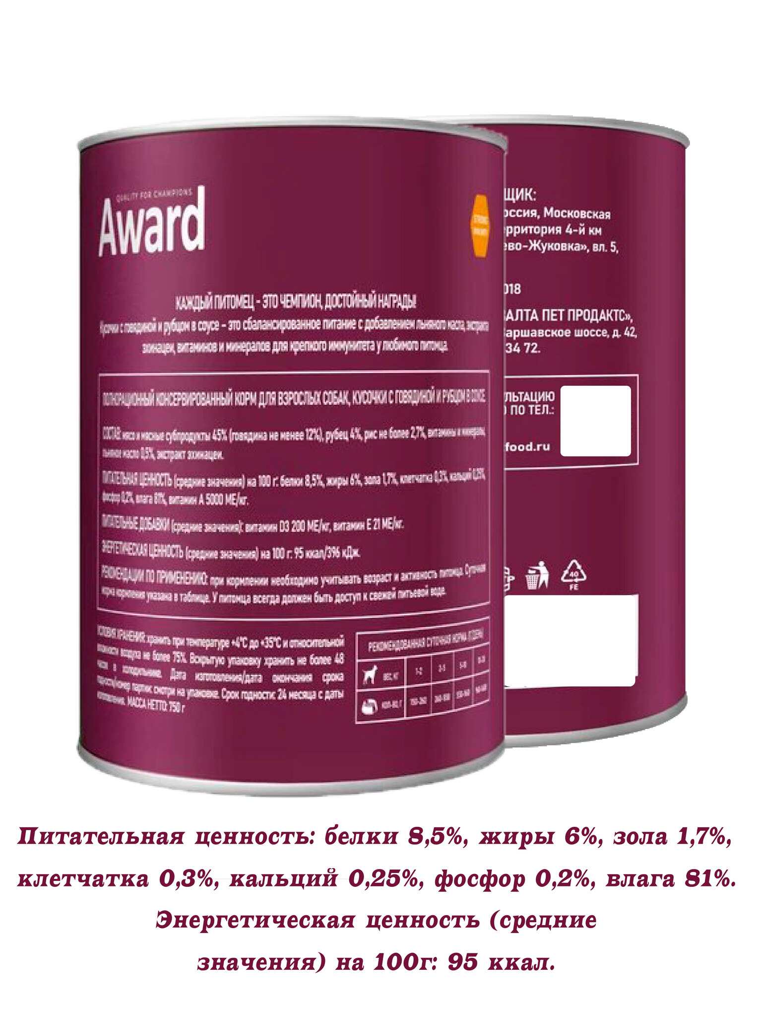 Корм AWARD — это отличный выбор для заботливых владельцев, стремящихся предложить своим четвероногим друзьям не только вкусное, но и полезное питание. Позвольте вашей собаке насладиться каждым приемом пищи с AWARD!